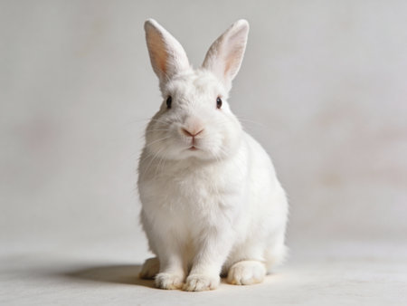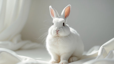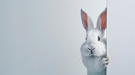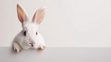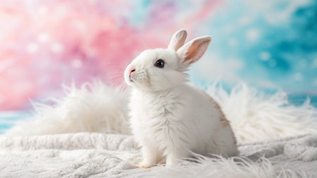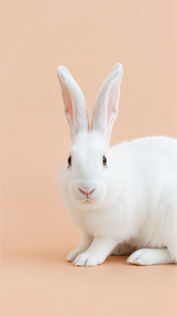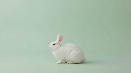 A charming white rabbit is sitting on a pastel background, providing ample copy space for text. This adorable image is perfect for easter or spring-themed designs and greeting cards.