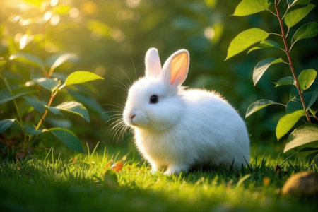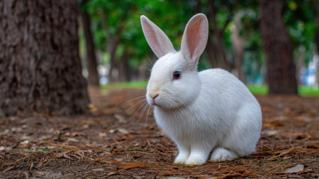 A beautiful white rabbit sits gracefully on the ground in a park setting, surrounded by lush greenery and gentle sunlight, capturing a moment of serenity.
