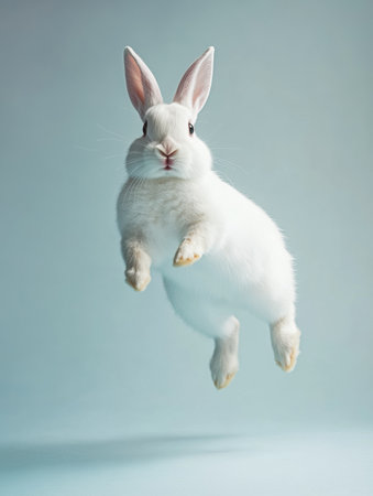 A white bunny is captured mid-jump with its ears perked up, showcasing its joyful leap against a smooth, clean background in a bright setting.