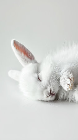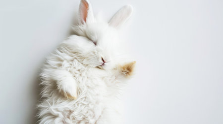 White fluffy rabbit sleeps on its back. Light background. Copy space. Greeting card concept. Generative AI.