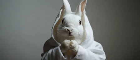 AI Generated. A white rabbit sits on top of a stack of white towels