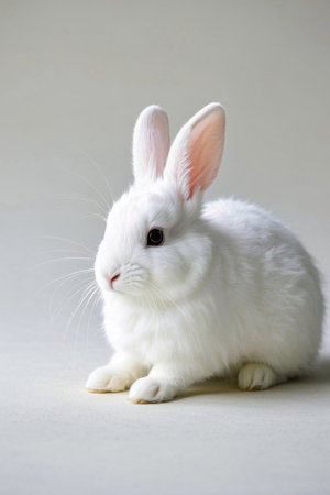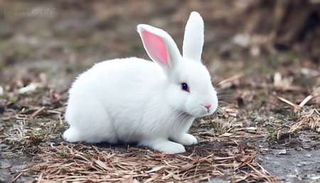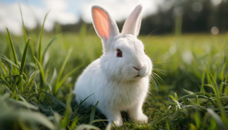 A cute white rabbit with soft fur, a delicate pink nose, and prominent long ears, captured in a clear and bright setting.