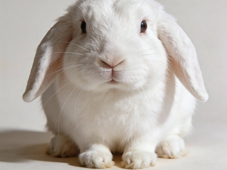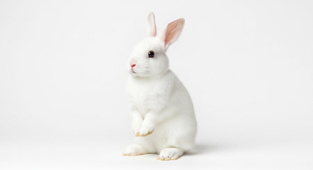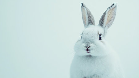A fluffy bunny with its nose twitching on a white background, with space for text or branding.