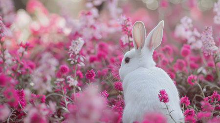 A white rabbit is seated amidst a vibrant field of pink flowers, its cotton-tail blending with the flora. The rabbit appears alert, gazing around the blossoming meadow.