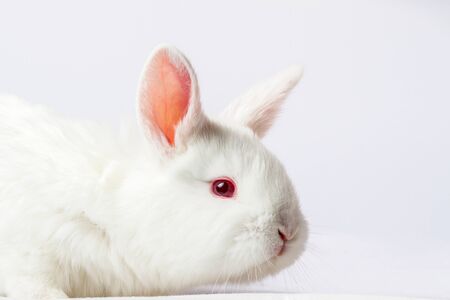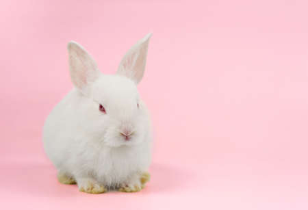 white rabbit isolated on pink background, young adorable fluffy bunny sitting on pink background