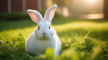 Cute white rabbit sitting on green grass in the garden. Easter concept.