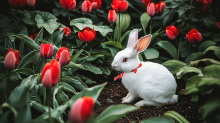 Charming white rabbit among vibrant red blooms in lush garden. concept of Easter bunny, nature's beauty, tranquility, springtime.