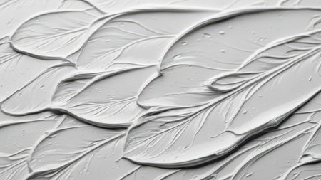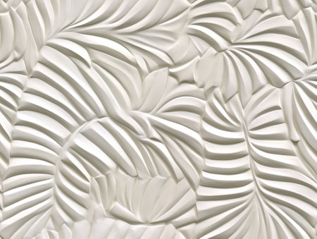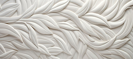 This image showcases a close-up view of a textured surface featuring white leaves. The leaves are intricately detailed with veins and have a glossy finish, giving the surface a three-dimensional appearance. The background is predominantly white, enhancing the contrast and highlighting the leaf patterns. This image could be used for various design purposes, such as wallpapers, textures, or decorative elements.