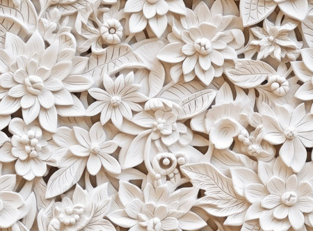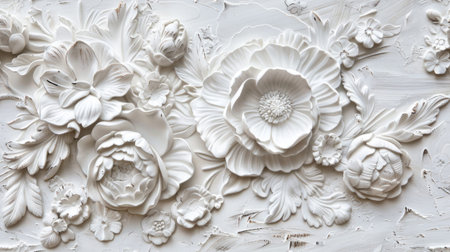 A close-up view of a white wall adorned with intricate floral relief, showcasing a delicate and elegant design.