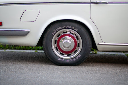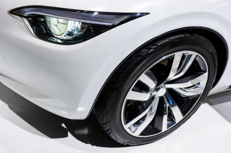 SINSHEIM, GERMANY - OCTOBER 16, 2018: Technik Museum. Right front wheel of modern white car.