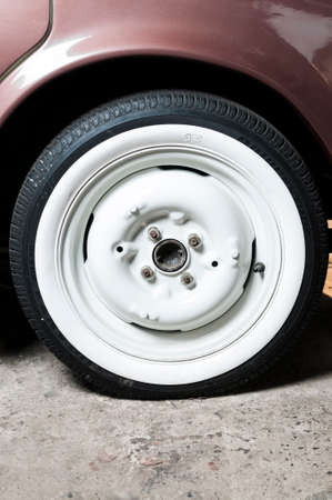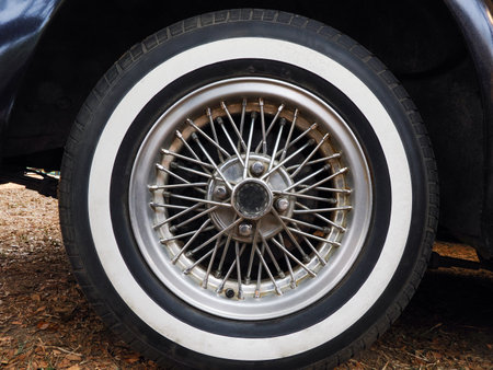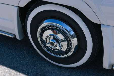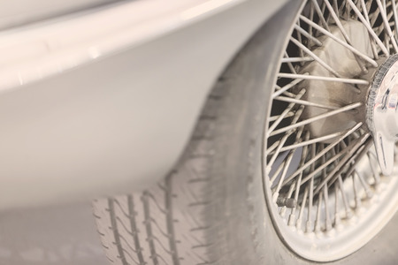 Wheel of an old classic retro car at an exhibition of vintage cars