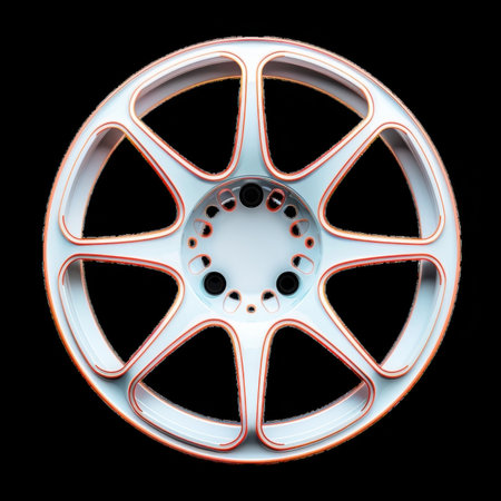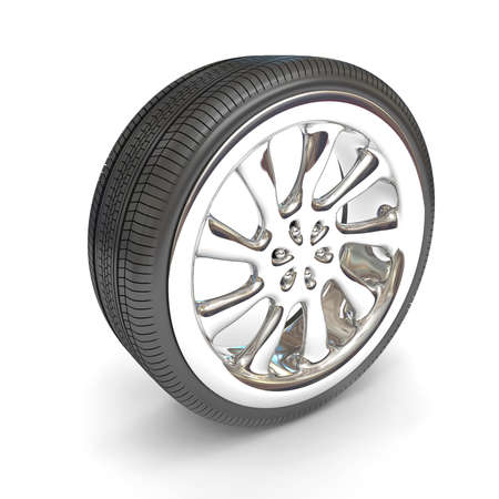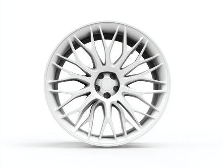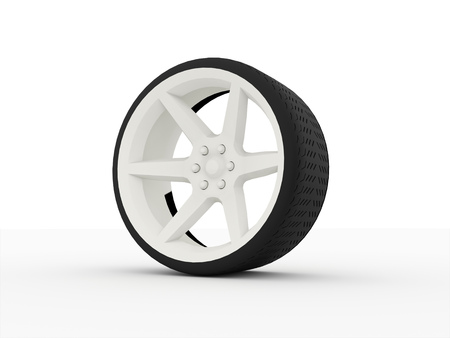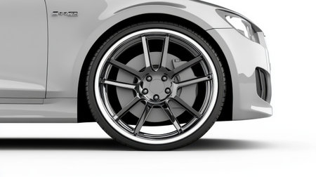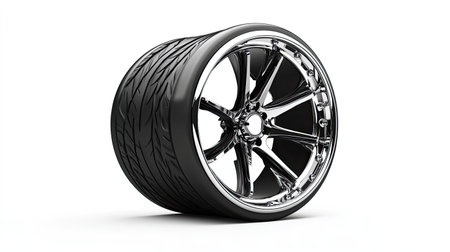 A contemporary car wheel viewed from the side, isolated on a white background, highlighting its modern design and features