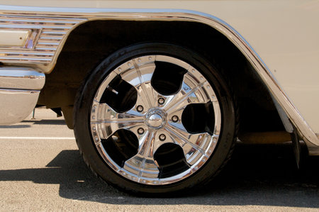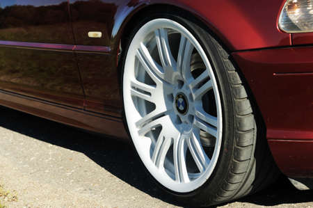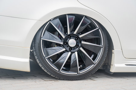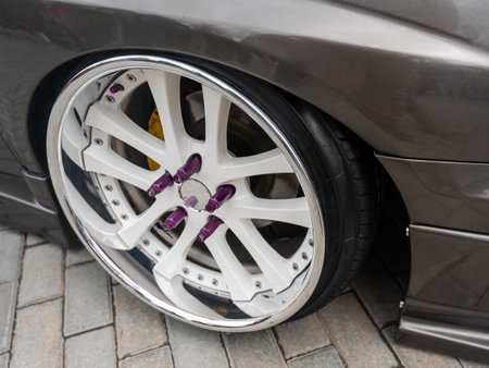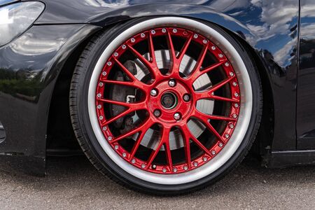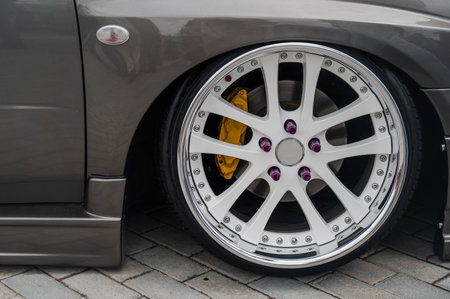 Lowrider custom tuned sport car wheel with small rubber tyre and large disk, close up