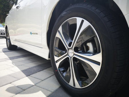 Bukit Tinggi Pahang,Malaysia - 24 Julai, 2019: Metallic White Nissan Leaf at Aurel Sanctuary Galery Bentong Pahang, compact five-door hatchback electric car manufactured by Nissan.