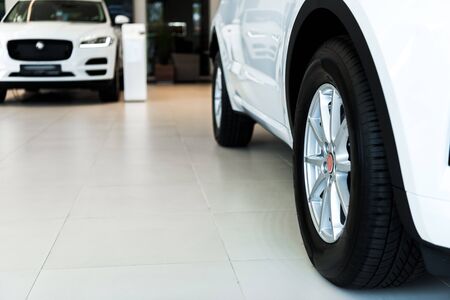 Vehicles Sales Industry. Modern Luxury Car on Display in a Dealership Showroom. Alloy Wheel Close Up.