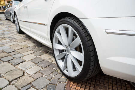 Car headlight and wheel with silver disk of comfortable sport sedan with white bodywork, luxury class vehicle
