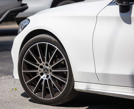 Moscow, Russia - July 06, 2019: White alloy wheels mounted on a Skoda car