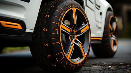 A striking image of a glossy alloy wheel featuring a polished finish, set against a vibrant black and yellow backdrop, highlighting modern automotive design.