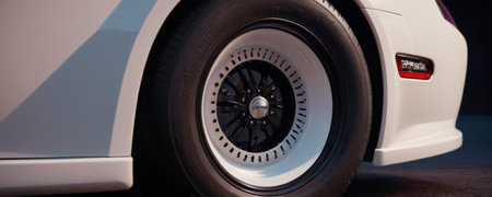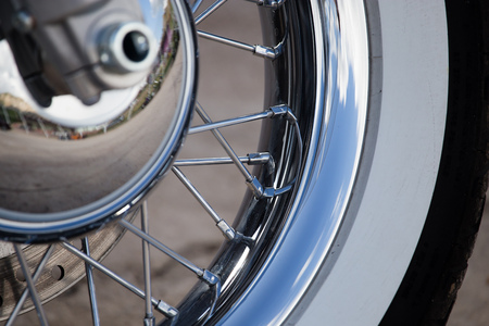 a shiny disc, black and white, a wheel of a car of old times. Close up of vehicle details. Concept of style and racing. Selective focus