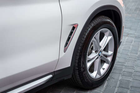 Ukraine, Odessa July 8 - 2021: Wheel with Pirelli Cinturato P7 tire of a new modern BMW SUV car. Back view