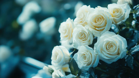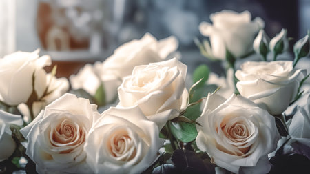 A delicate arrangement of white roses creates a soothing atmosphere with gentle light highlighting their natural beauty and elegance, perfect for a variety of uses.