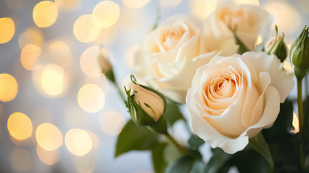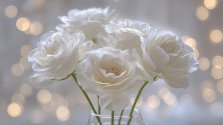 A serene close-up image of exquisite white roses, their delicate petals glowing softly amid a backdrop of warm bokeh lights, perfect for romantic themes or celebrations.