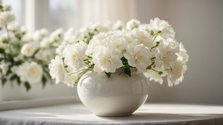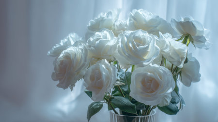 A stunning arrangement of elegant white roses bathed in soft natural light, creating a serene atmosphere ideal for romantic occasions or artistic decor.