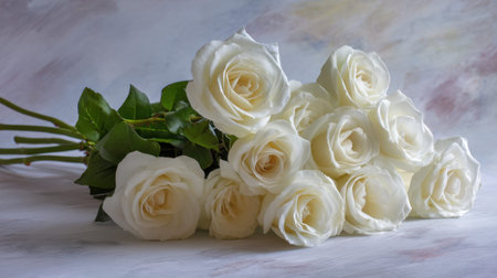 A beautiful arrangement of elegant white roses set against a soft wave background, ideal for weddings and romantic occasions, evoking feelings of love and tranquility.