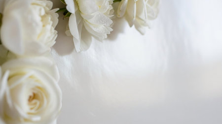 Closeup of white wedding roses on light romantic background with copy space
