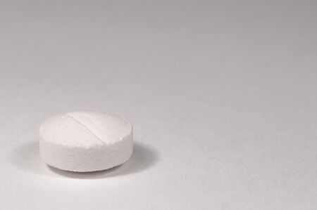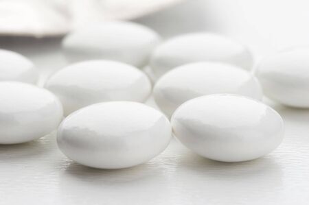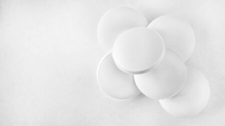 White medical pills and tablets on white background. Closeup photo of medical preparations with copy space