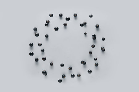 Frame made of blackcurrant flying on gray background
