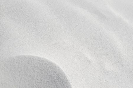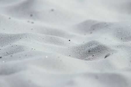 Close-up of white sea sand on a deserted beach. Concept of holidays and bright Sunny days. Selective focus macro shot with shallow DOF