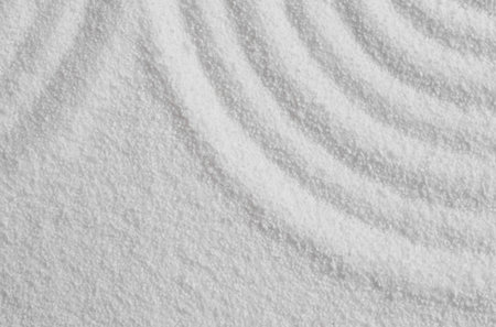 Zen rock garden. Circle pattern on white sand, top view. Space for text