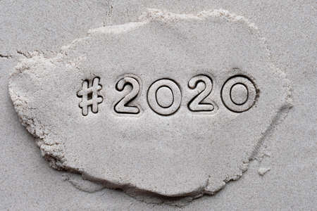 Top view of hashtag sign and number 2020 on wet sand, natural background. Happy New Year 2020!