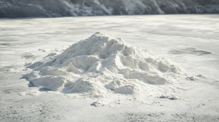 This image features a pile of fine white powder on a textured surface, showcasing an abstract yet natural look with soft lighting in a serene setting.