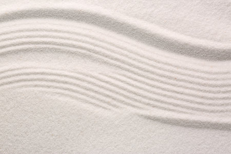 Zen Garden White Sand Background, Line Wave Texture Pattern Japanese Abstract Nature Spa, Harmony Japan Grey Beach Top View, Calm Peace Balance Wellness Scene Space, Meditation Mental Wellbeing Art.