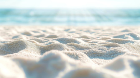 Fine grains of golden sand are scattered across a peaceful beach. The bright sun shines overhead, casting a warm glow, while soft waves roll in the distance.