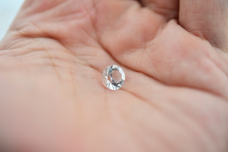 brilliant cut diamond held by tweezers on white background