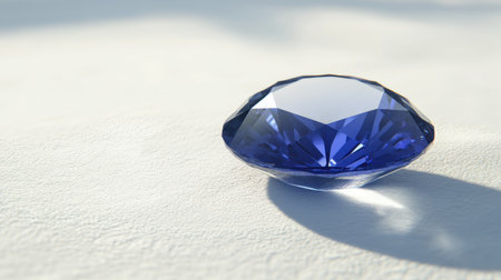 Close-up of sapphire surrounded by subtle shadows on white matte surface