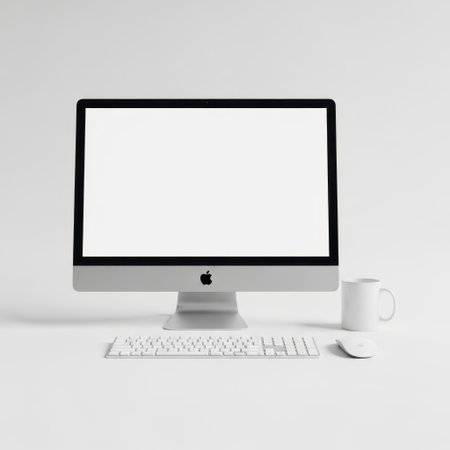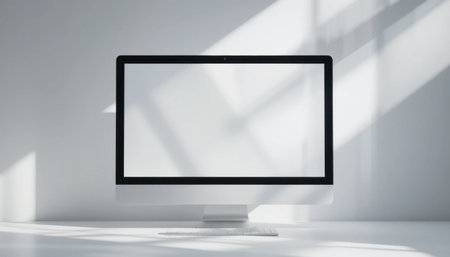 A sleek computer monitor is displayed on a clean desk, illuminated by gentle sunlight creating soft shadows.