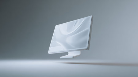 Monitor mockup floating in mid-air with soft drop shadow on neutral gradient background, futuristic and minimal design concept -