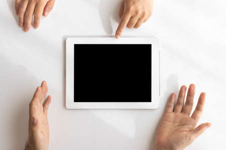 Men's and women's hands pointing to a tablet device (Japanese, 30s)
