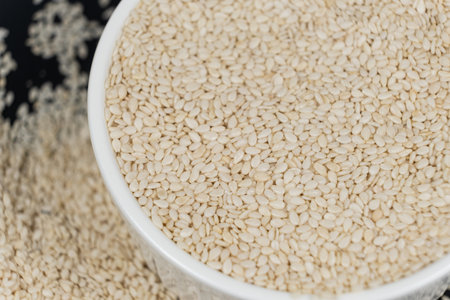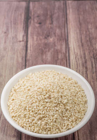 Organic natural white sesame seeds in bowl.