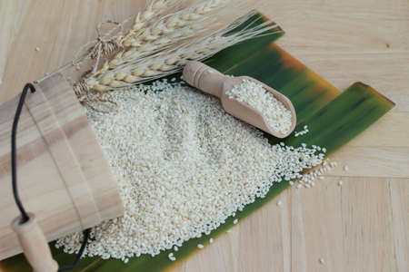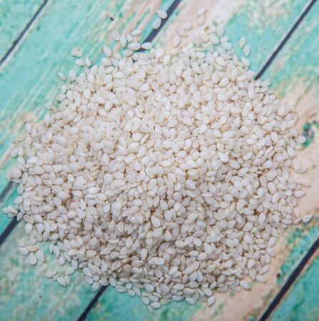 White sesame seed over wooden background