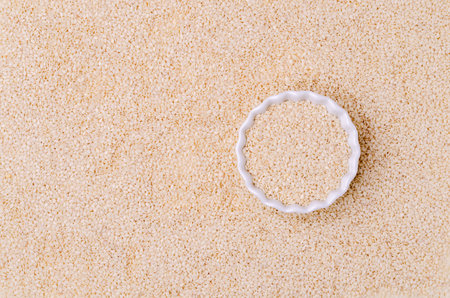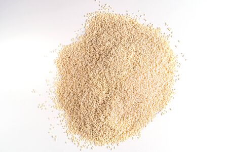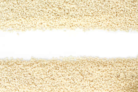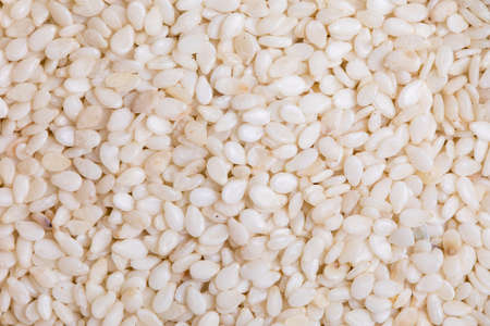 Closeup of white sesame seeds background. Top view. Studio shot.