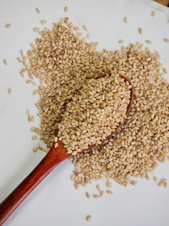 white sesame on wooden table