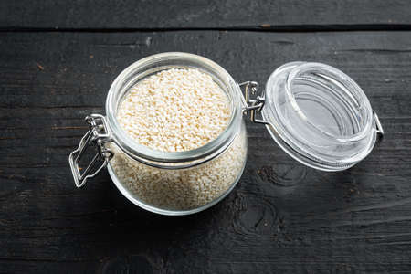 White sesame seeds set, in glass jar, on black wooden background