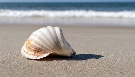 Seashell on sandy beach under sunlight, close-up macro. Natural coastal beauty concept.