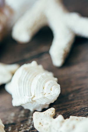 Seashells on the vintage wooden background. Summer wallpaper.
