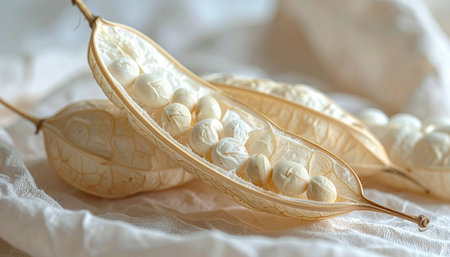 Close-up of two dried, translucent seed pods filled with small, pale white seeds, resting on a soft white fabric.